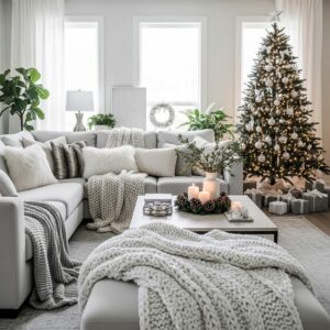 Textures bring warmth and depth, balancing the clean lines of modern furniture with cozy Christmas comfort.