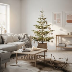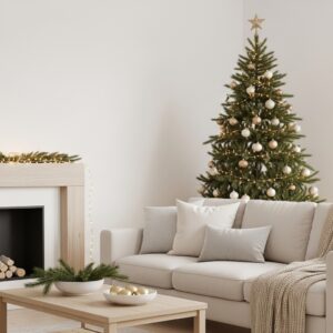Add neutral-toned ornaments, pine branches, and simple star decorations for an effortlessly chic Christmas vibe.