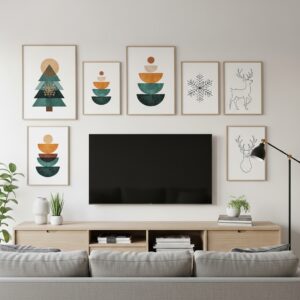 Geometric trees, minimalist snowflakes, or line-art reindeer pieces add holiday spirit while maintaining a clean, modern vibe.
