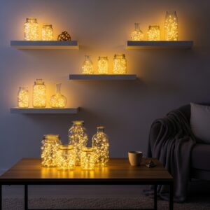 Use warm or cool LED fairy lights inside glass jars or vases to bring subtle sparkle.