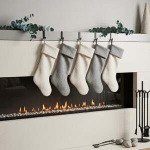 Hang simple linen or velvet stockings in cream, gray, or white tones along your mantel or a sleek wooden beam.