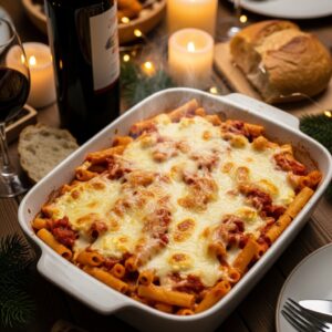 Baked ziti with three cheeses is a comforting and crowd-friendly New Year’s Eve dinner option.