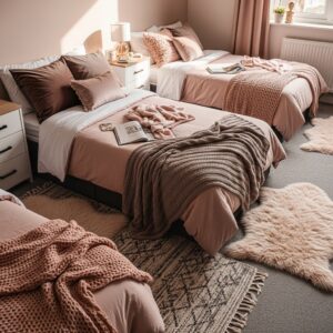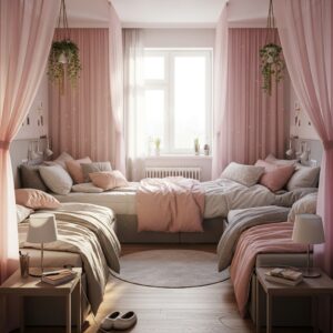 By mixing shades, layering textures, and adding functional pink accents, the room can feel stylish, cozy, and harmonious for three people.