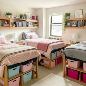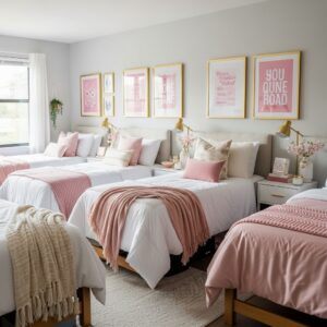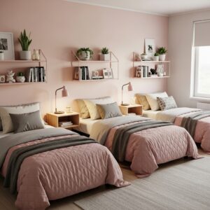 Install small pink wall shelves near each bed for personal items—books, plants, or small decor pieces.