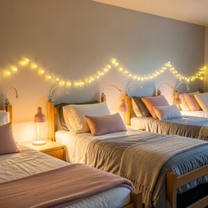 If privacy is limited, hang soft pink curtains or sheer dividers between beds.