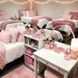 Create small communal pink-themed corners—like a shared vanity with pink mirrors or a bookshelf with pink decor items.