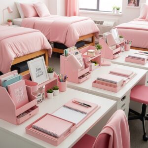 Add pink organizers, pen holders, or trays to personalize each workspace.