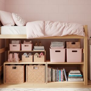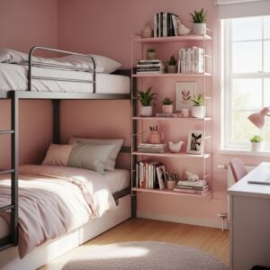 Install small pink shelves near the bunk bed to hold books, decorations, or small plants.