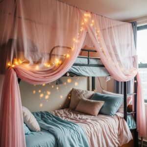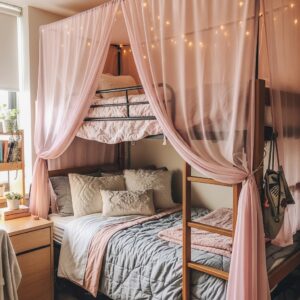A sheer pink canopy can create a dreamy, cozy vibe for the top bunk.