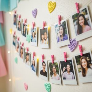Adding little pink hearts or doodles around the photos makes the wall extra playful and cheerful.