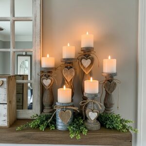 Place them on mantels, side tables, or shelves, and add a few small hearts or greenery for a Valentine touch.