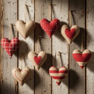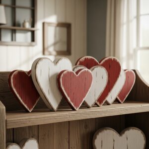Use thin plywood or unfinished wooden hearts and paint them with muted colors like barn red, cream, or antique white.