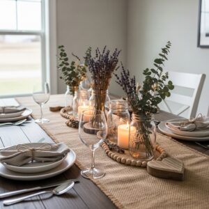 Use a neutral tablecloth or runner and layer it with burlap or lace.