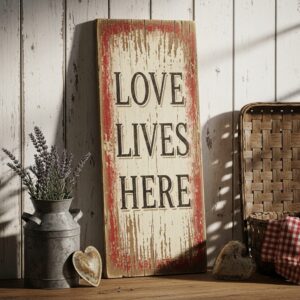 Simple wooden signs with vintage-style lettering are a beautiful way to decorate for Valentine’s Day.