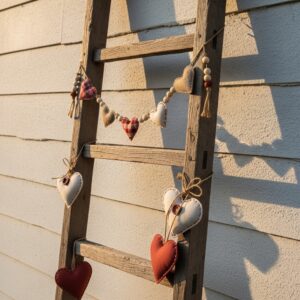 Create a primitive Valentine garland using fabric hearts, paper tags, or small wooden cutouts.