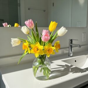 Place seasonal blooms like tulips, daffodils, or lilies in small vases on the vanity or windowsill.