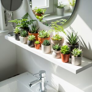 Small potted plants like succulents, ferns, or orchids thrive in bathrooms and bring life to the space.