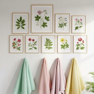 Frame small floral or leaf-themed artworks and hang them above the towel rack or near the mirror.