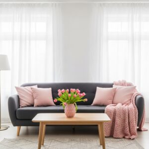 A dark grey sofa paired with blush pink accents creates a soft and elegant spring look.