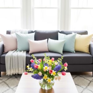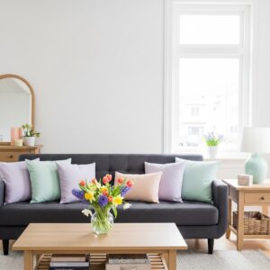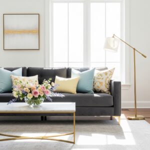 The rich tone of a dark grey sofa provides a beautiful contrast against soft spring palettes like pastel pink, sage green, light blue, and creamy whites.