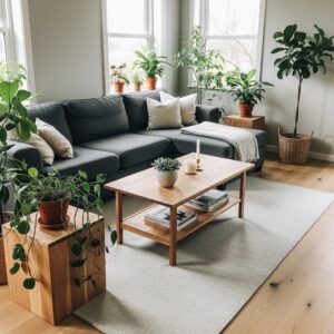 Natural wood furniture pairs beautifully with a dark grey sofa and enhances the organic feel of spring decor.