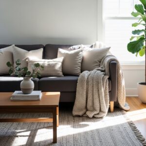 Draping a throw casually across the arm or back of the couch adds comfort and visual interest.