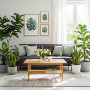 Incorporating indoor plants around the sofa can further enhance the nature-inspired aesthetic.