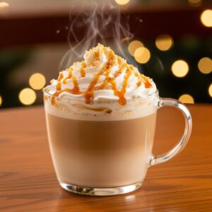 Sweet and indulgent, this latte combines caramel flavors with a crunchy brulee topping for a festive treat.