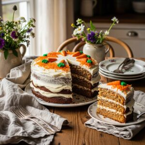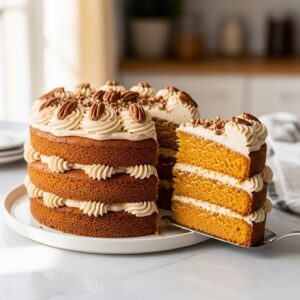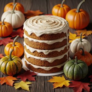 A moist pumpkin cake layered with cream cheese frosting, capturing the flavors of fall in every bite.