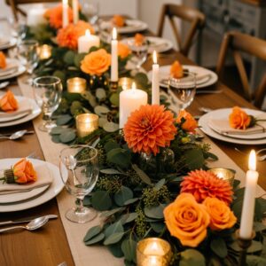 Nestle votive candles and clusters of flowers like orange roses or dahlias throughout the garland.