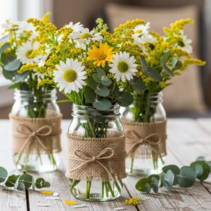 Wrap twine or burlap around the jars, and fill them with goldenrod, daisies, and small branches of eucalyptus.