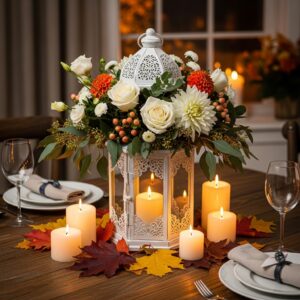 Surround the lantern with scattered petals or leaves for a romantic Thanksgiving centerpiece that combines light and floral beauty effortlessly.