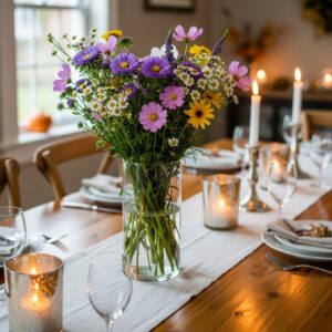Arrange fresh wildflowers in a tall vase and place it at the end of your dining table or buffet area.