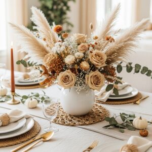 Mix pampas grass with dried flowers and neutral-toned roses in a white ceramic vase.