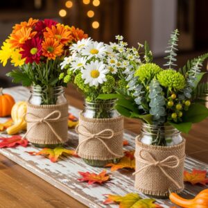 Wrap each jar with burlap and twine. Line them up across your table runner for a cozy farmhouse feel.