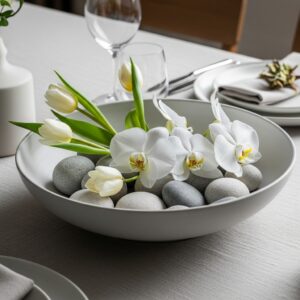 Use a shallow ceramic bowl filled with white orchids or tulips and smooth river stones.