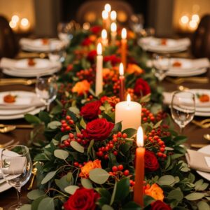 Mix roses, eucalyptus, and berries for a romantic and glowing Thanksgiving setting.