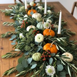 Lay a garland of eucalyptus and olive branches down the center of your table, then tuck in mini pumpkins and a few scattered flowers for a fresh, earthy arrangement.