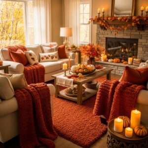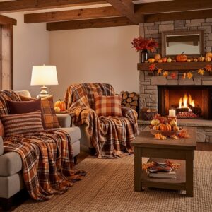 Layer your sofa and armchairs with plush throw blankets in autumn-inspired colors like burnt orange, mustard yellow, or deep burgundy.