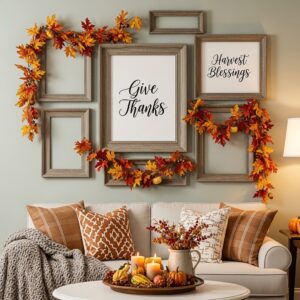 Framed prints with messages like “Give Thanks” or “Harvest Blessings” add warmth and personality to your space.