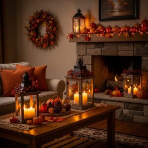 Set a cozy tone with candles and lanterns. Use a mix of pillar candles, votives, and LED flameless options placed on side tables or mantels.