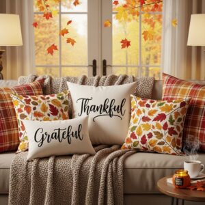 Swap out your everyday cushions for Thanksgiving-themed throw pillows featuring words like “Grateful,” “Thankful,” or “Blessed.”
