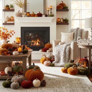 Use various sizes, colors, and textures of pumpkins throughout your living room.