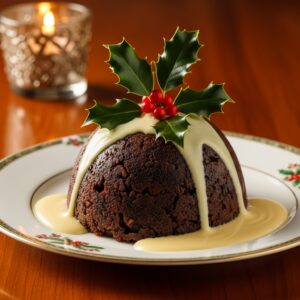 Rich, spiced, and filled with dried fruits, it’s often served with custard or cream.