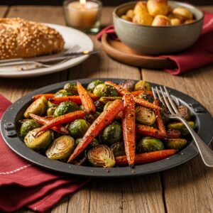 Roasted vegetables like Brussels sprouts or carrots add color and nutrition to the Christmas feast.