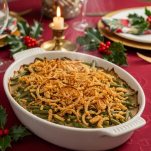 Creamy sauce, tender green beans, and a crispy topping create a comforting addition to the menu.