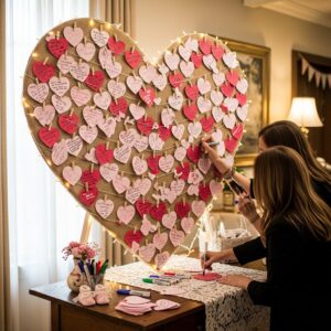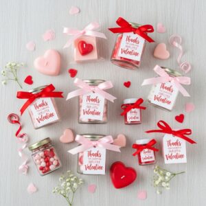 Give guests personalized Valentine’s gifts, such as heart-shaped soaps, candles, or mini candy jars with pink or red packaging.