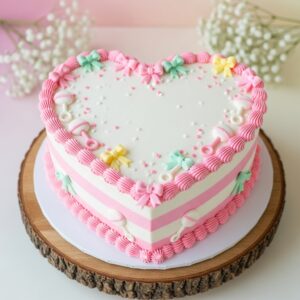 A heart-shaped cake with pink and white frosting can be adorned with edible flowers, tiny bows, or a small fondant baby rattle.