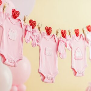 Mix tiny pink onesies, socks, and mittens with red or white heart decorations.