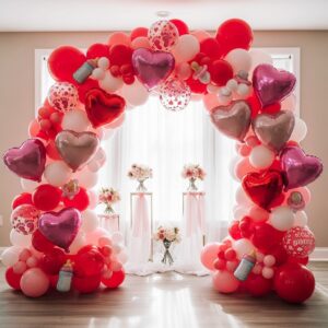 Create a statement with a balloon arch featuring pink, red, and white balloons.